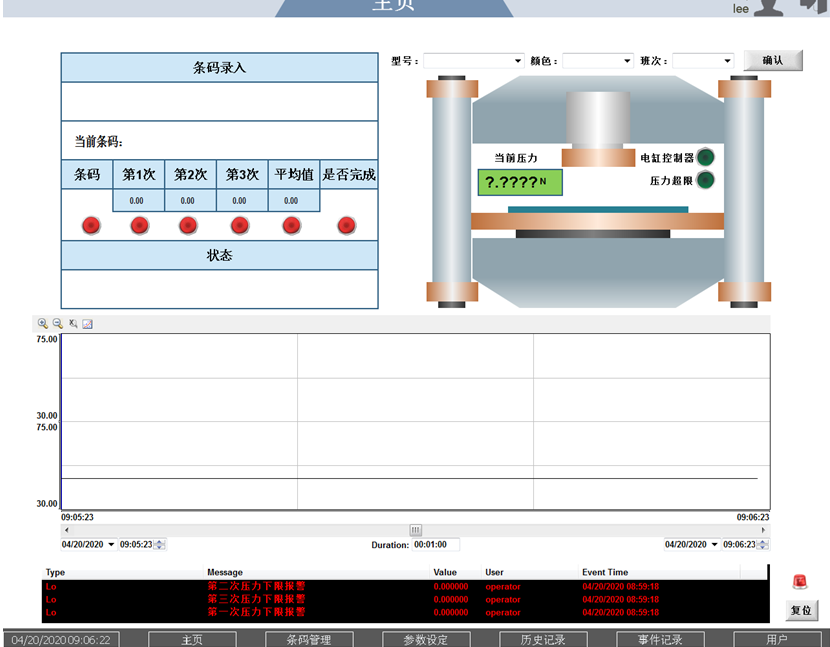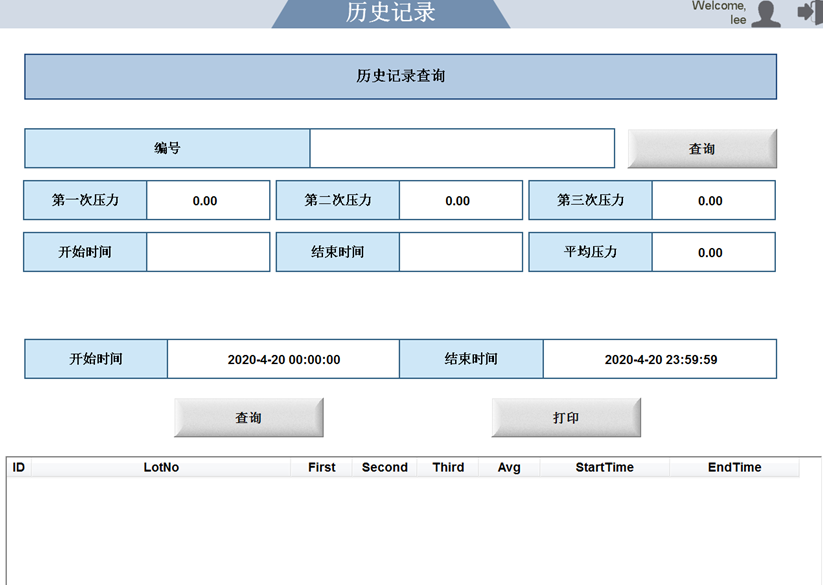 歷史記錄 利用條碼或者時(shí)間查詢壓力測試數(shù)據(jù)。 可以查詢該條碼的車頂棚是否檢測過。 輸入開始時(shí)間,結(jié)束時(shí)間,點(diǎn)擊下方的“查詢”按鈕,如果有記錄,則占擊“打印” 按鈕,可以打印PDF文檔。 事件記錄 顯示人員的操作記錄